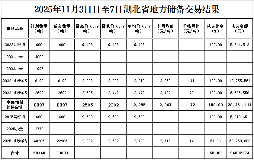 本周湖北地储成交各类粮油33083吨。其中销售:2023年菜籽油600吨,成交率100%,成交均价9408元/吨;2022年中晚籼稻6199吨,成交率100%,成交均价2219元/吨,环比下跌41元/吨;2023年中晚籼稻2698吨,成交率100%,成交均价2472元/吨,环比上涨70元/吨。采购:2025年菜籽油600吨,成交率100%,成交均价9698元/吨;2025年中晚籼稻22986吨,成交率57.06%,成交均价2730/吨,环比上涨14/吨